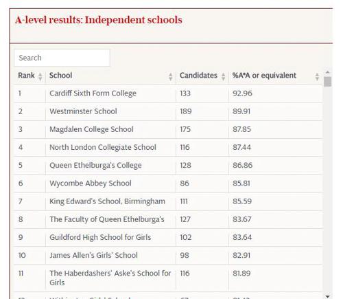The Telegraph以往都是以获得A*和A的学生百分比来排名,把私校和公校, GCSE 和A-Level 分开,私校会有专门的排行榜,2016年私校A-Level成绩排行榜前100名,其中Cardiff Sixth Form College, Westminster School和Magdalen College School名列前三。