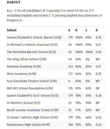 伦敦晚旗报也有对英国伦敦地区的学校进行排名,按地区划分,以每个地区学校GCSE 和A-Level 通过率A*-C (图中B项数据)从高到低排。但是由于一些独立学校采用的是IGCSE课程,排名会受影响整体下降,不一定准确代表学校的教学质量和学生成绩。以下几个地区的排名均为2016年最新。