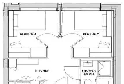 两室一厅套间,一个卫生间,一个厨房,厨房和卧室分开,适合两个小伙伴一起合租。两个人共用厨房客厅,share的人少自然私密性更好一些。房型是这样: