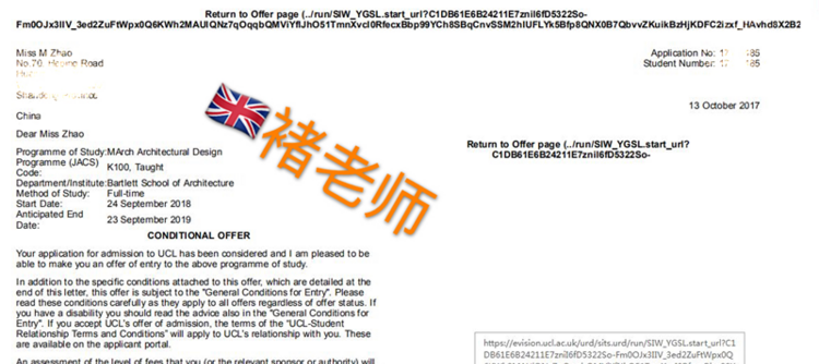 经过和褚小艳老师详细沟通后,老师给学生进行了非常专业的规划,因为虽然学生准备时间比较晚,但是作品集做的非常精细,所以褚小艳老师大胆帮学生定位比较高的院校,基本全部是世界前100的学校。同时,因为褚小艳老师具有丰富的文书写作经验,所以还帮助学生从PS的撰写、推荐老师选择、实习材料和获奖经历等各方面进行梳理挖掘,最大程度的帮学生争取录取。最终在老师耐心的指导以及赵同学的极力配合下,顺利拿到QS世界排名7的伦敦大学学院巴特莱建筑学院的OFFER,让赵同学圆梦英伦!