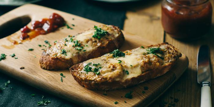 拿片面包在Toaster(面包机)里烤到脆脆,在一面撒上Cheddar(英国产切达干酪)放入已预热的烤箱,温度设到最高档,大约两分钟后奶酪融化了,这时用小刀将其在吐司上抹匀,大功告成(如下图)。干货,没有加任何配料,不养眼,但是很好吃,关键是制作过程非常简单。