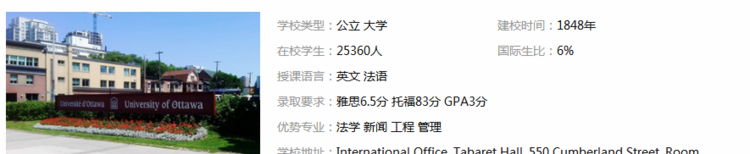 渥太华大学是加拿大安大略省渥太华的一间研究型大学,是加拿大顶尖研究型大学组织U15成员之一,也是加拿大建校历史最长的大学之一。渥太华大学长期位列加拿大医博类大学前十强。学校坐落于加拿大首都渥太华市中心,毗邻加拿大国会山,地理位置十分优越。前身是由无玷圣母献主会1848年创办的College of Bytown,原为一通识教育学院,1800年代开始以法文与英文教授纯科学及应用科学,1872年开始颁授学士学位,1875年颁授硕士学位,1888年颁授博士学位。渥太华大学还积极致力于加强世界间的联系,其国际合作项目涉及欧、非、拉美等众多地区。创立伊始,渥太华大学就显示出她的强大实力。时至今日,已一跃成为声名大噪的学术中心。全校包括在校生与教职工在内的总人数已达30000人之多,其中近千名国际留学生占学生总数的4%。