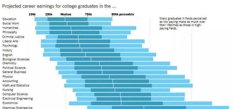 比如,收入位列第60百分位的英语专业学生一生能挣276万美元,同样排名的心理学专业学生能挣257万美元,历史专业学生则能挣264万美元。