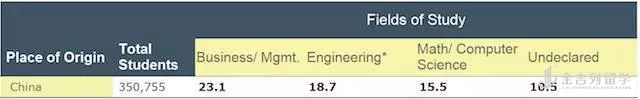 2016/17学年,在美中国学生就读最多的三个专业依次为:商科,工程,数学与计算机科学,占总人数的57.3%。