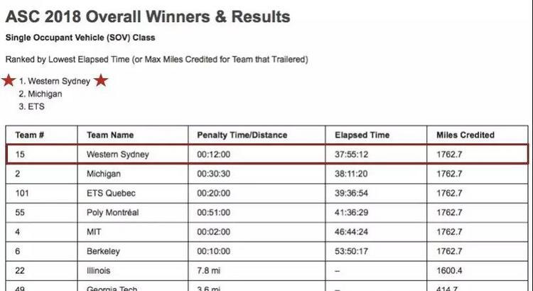 2018年世界太阳能汽车挑战赛美国赛区,西悉尼大学实力辗压美国众多牛队,包括MIT麻省理工,University of Michigan密歇根大学等。一夜之间,在美国爆红,成为历史上第一支澳大利亚队伍战胜美国队伍。精彩的赛果如下,