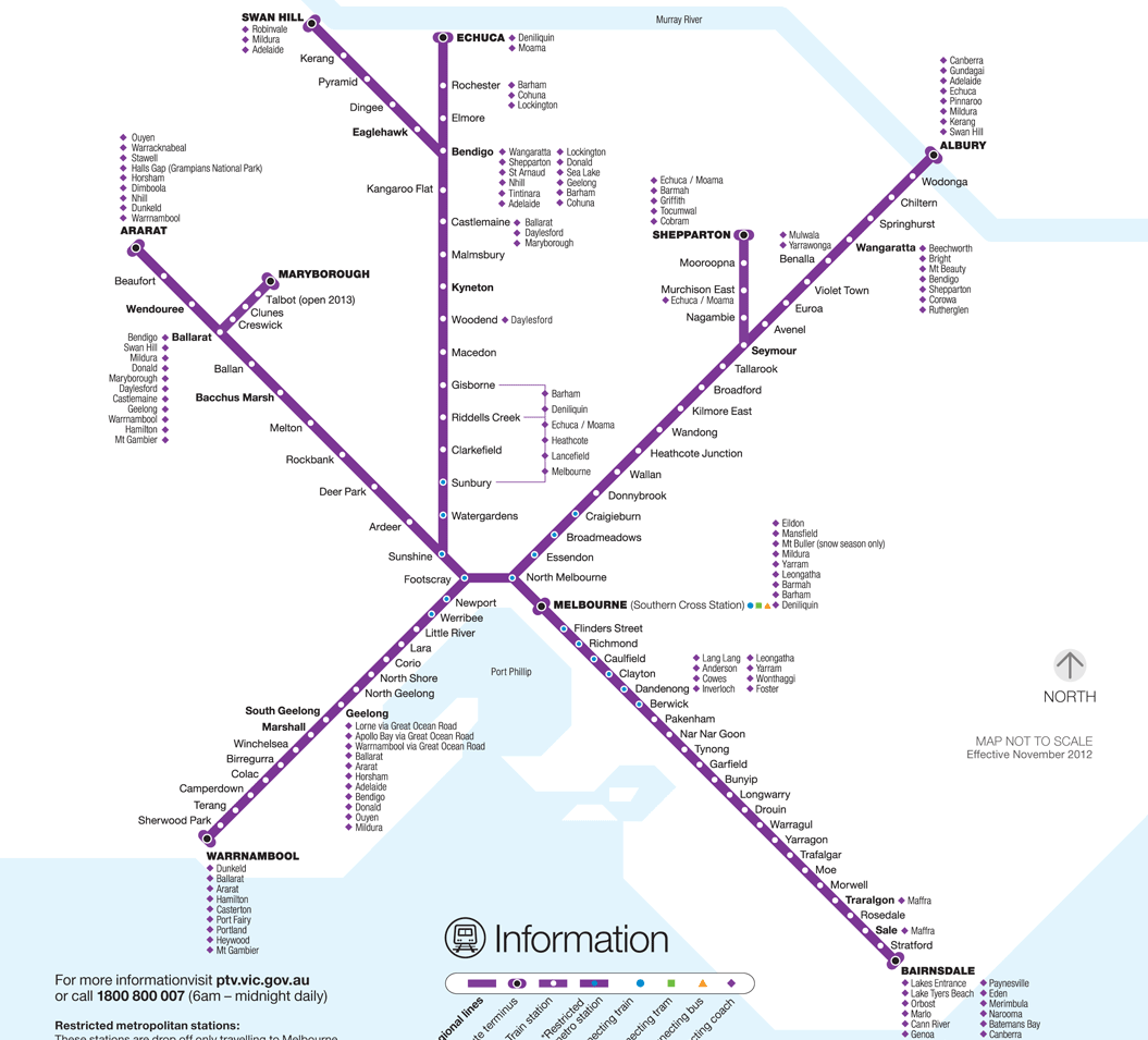 V/Line城际火车是区别于墨尔本市中心CBD的火车,是从市区通往墨尔本郊区Geelong、Warrnambool、Ararat等和维多利亚州内大小城镇的长途公交工具。
