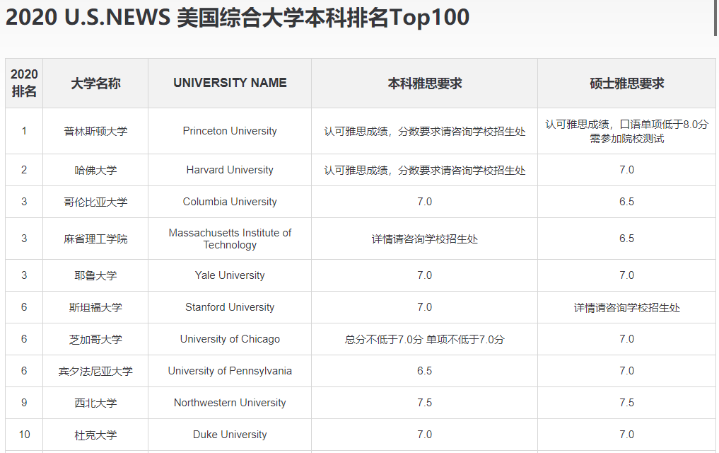 接下来,放出2020 U.S. NEWS美国综合大学排名TOP10的雅思要求给大家参考: