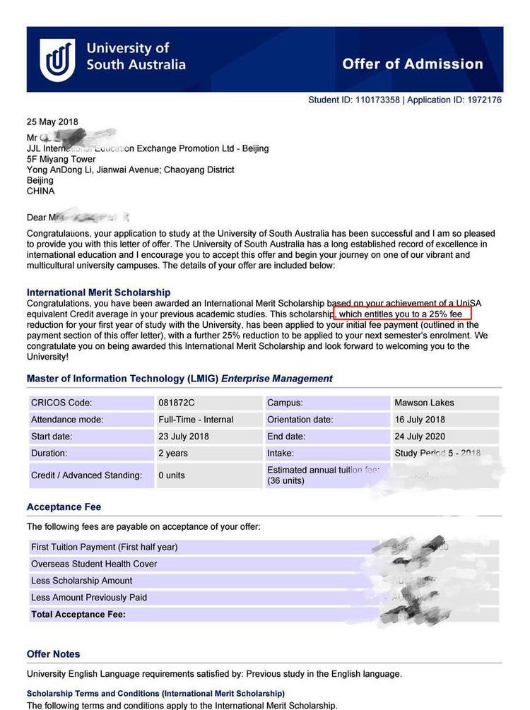 5、最终学生拿到了IT专业的录取通知书。并申请到25%的学费减免。学生非常开心。
