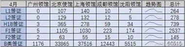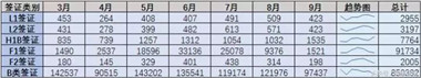 根据3-9月的签证签发数来看,各类签证获批最多的月份不同,但都是4月最低。
