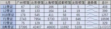 而H-1B签证则是5月,6月和9月最多。这应该跟H-1B申请流程有关,首次H-1B签证是每年的4月开始允许递交,到10月才开始生效。
