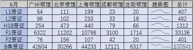 2017年4-9月美国五大领馆的主要签证签发数统计如下图: