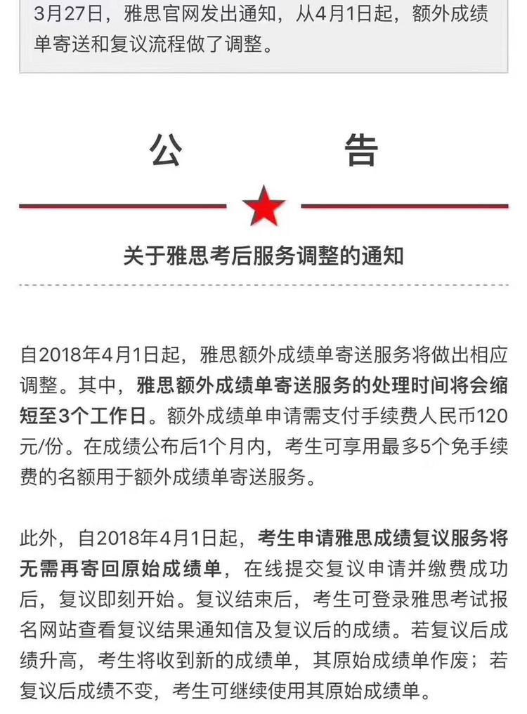4月1日起,雅思额外成绩单寄送服务的处理时间会缩短至3个工作日,在雅思成绩2年的有效期中,考生可在公布的1个月内最多免费申请5份额外成绩单寄送,超过1个月或第六份申请,要支付人民币120元/份。复议费也涨了,调整为1400元。