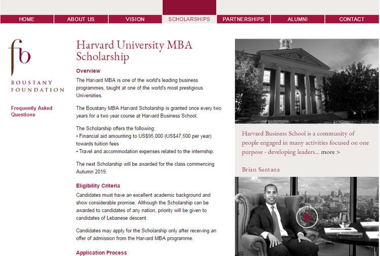 Boustany Foundation面向哈佛商学院MBA课程学生设立奖学金,这个项目每两年颁一次,包含90000刀学费+差旅费+住宿费(每年45000美元),要求申请者具备优秀学术背景,不限国籍,申请时需提交成绩单、GMAT或GRE分数,雅思不低于7.5或托福不低于109。
