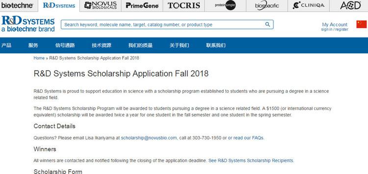 知名生物科技公司Bio-Techne旗下的子公司R&D Systems设立奖学金项目,项目面向所有攻读科学相关领域的学生,学位不限,国籍不限。奖学金金额为1500刀。申请者不限国籍,在任何科学相关专业就读的本科生、研究生或者证书课程学生都可申请。申请者英语水平需达到托福78分、iBT/547及雅思6.5分。