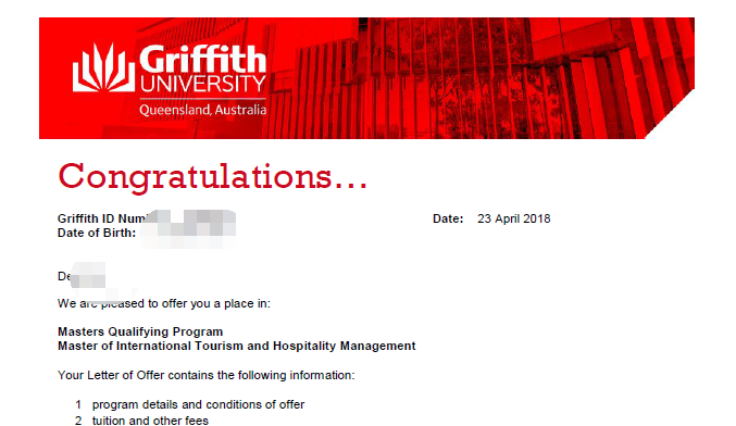 今年他找到了我,说了自己的想法。听说澳洲不但可以专科直接升读硕士,而且就读他最喜欢的酒店管理专业还不需要大专相关的背景。更重要的是,我给他的成绩进行了评估,判断他能申请到全澳洲第一,世界排名第九的格里菲斯大学的酒店管理硕士。衔接方式:4个月硕士预科加2年硕士.