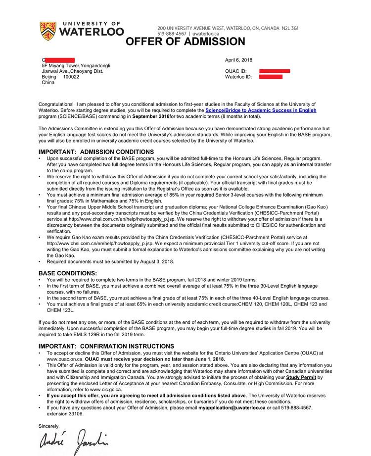 该学生整体高中学术条件非常比较不错,但是语言成绩单不够,在做申请方案的时候,给学生申请了该大学的3个专业,滑铁卢大学的本科专业既有直录的,也有双录取的,申请时,学生还未参加雅思考试,为了帮学生尽可能的拿到Offer,既申请了直录的专业计算机工程专业,也申请了可以双录取的生命科学专业。很遗憾,学生忙于备战高考,雅思成绩最终只提供了5.5的成绩。 所以,在申请的时候,不防多申请几个专业来增大录取概率。