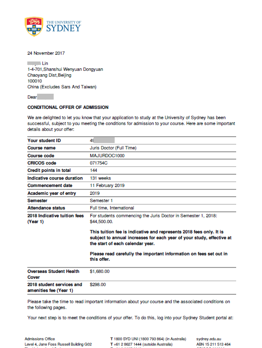 录取结果:悉尼大学