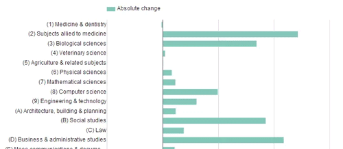 下表是2016-17学年度和2015-16学年度,英国各专业录取人数的对比。可以看出,绝大多数专业都在扩招,只有三个专业招生人数出现负增长,它们分别是: