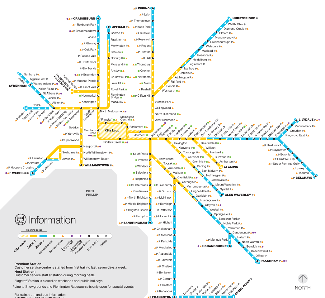 远距离需要坐火车到达的景点主要有:蒸汽小火车和菲律普岛看小企鹅。市中心CBD是City Loop环线这一小片。如下图所示,火车站点Belgrave是普芬利蒸汽小火车的起点。从从市中心出发,约1小时可以到Belgrave,下车步行3-5分钟就可到达蒸汽小火车的出发点,非常方便。