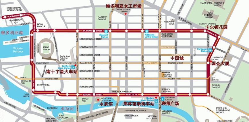电车网络非常发达,图中深红色虚线是:CBD环线免费电车35路City Circle Tram ,环线中间就是CBD。可以看到电车最密集的部分就在CBD以及穿过联邦广场到墨尔本大学的纵线。