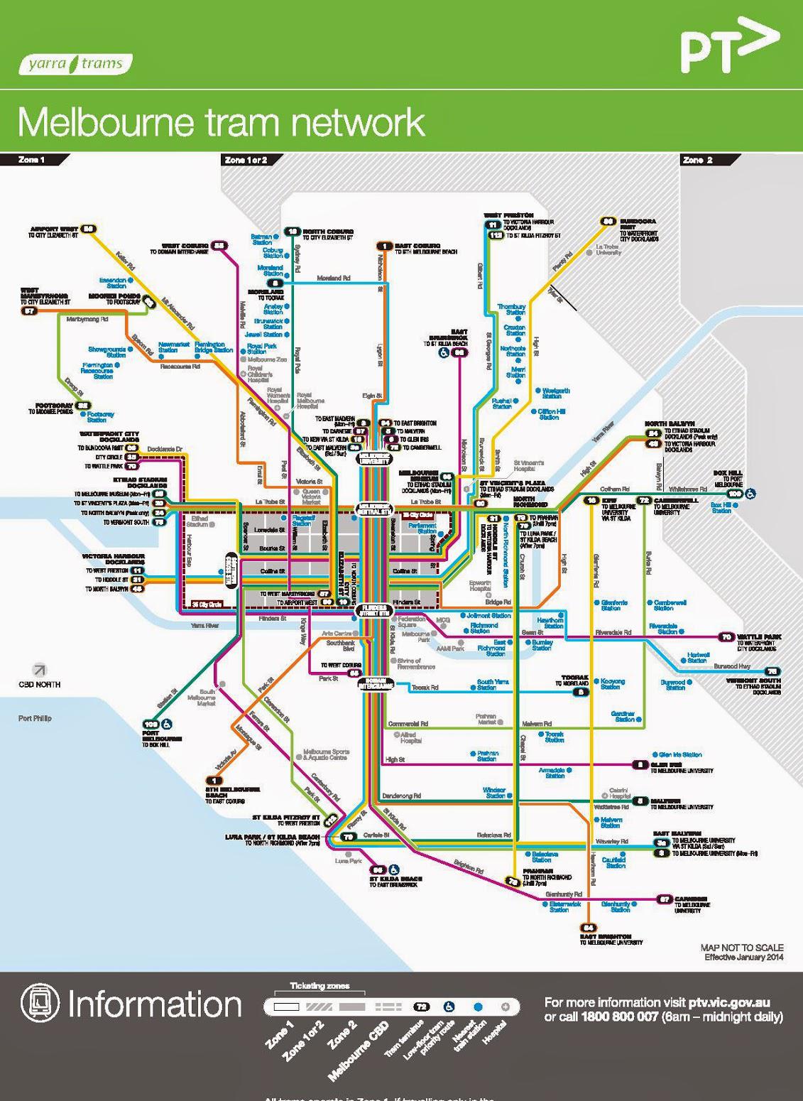 墨尔本电车网络图:(标出墨尔本大学,联邦广场,St KildaBeach)