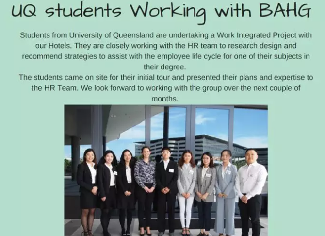 近期,我们的学生刚刚完成了与Brisbane Airports Hotels Group合作的一个项目。他们和该企业的HR团队紧密合作,研究、设计和推荐了针对员工生命周期管理的策略,最后递交的成果受到该集团的高度认可,并被其人力资源部门直接实施。通过一个学期高强度的项目运营,学生们深觉自己如同接受了“岗前培训”一样收获颇丰。