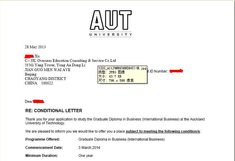 一个月内顺利拿到奥克兰理工大学的offer,圆了学生的名校梦。拿到offer后,学生开始准备签证材料,于2013年7月份去奥克兰理工大学的语言中心学习语言,通过学校内部测试或考雅思可以入读第二年2月主课。研究生预科雅思的入读要求是6.5分,单项不低于6.0。