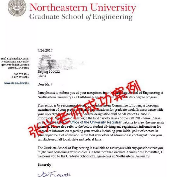 在选择学校的过程中,该学生比较倾向于大城市,为了方便找实习。张老师主要给他推荐了美国东北部地区,五大湖地区和西海岸地区。定位的学校主要从波士顿,纽约,芝加哥,洛杉矶,西雅图这几个大城市中选择。经过多次讨论和筛选,将目标学校定位于全美综合排名39的东北大学(MA, Boston)。之后不久,美国东北大学工程学院的研究生招生办公室主任到访北京举行招生说明会,张老师将这一关键信息及时传达给该学生,为学生准备了一份英文的简历,并做了多次的面试辅导。