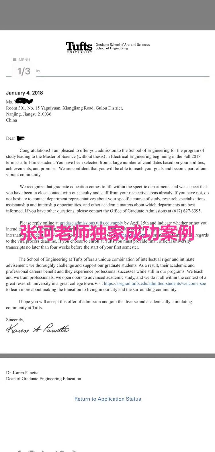 在写文书阶段,老师充分挖掘学生的活动经历,多次沟通文书思路。对于推荐信部分,学生找到了多个推荐人,针对TOP 30学校特 点,选择了其中的3封推荐信进行了提交。在准备简历和主文书的过程中,学生主动和老师相互配合,很顺利的完成了初稿。确定初稿之后, 老师和学生一起进行多次的校对和修改,确保文书的质量。 确定文书的终稿之后,老师指导学生准备申请材料,帮助学生提交了申请。跟催、补件等每个环节认真把控。爱笑的女生运气都不会 太差,学生顺利地拿到了塔夫茨大学,圣路易斯华盛顿大学,纽约大学的录取。纽约大学还给了6000美金的奖学金。