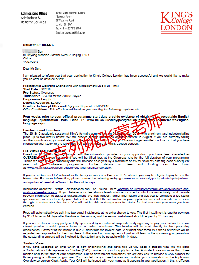 录取专业:Electronic Engineering with Management MSc电子工程管理