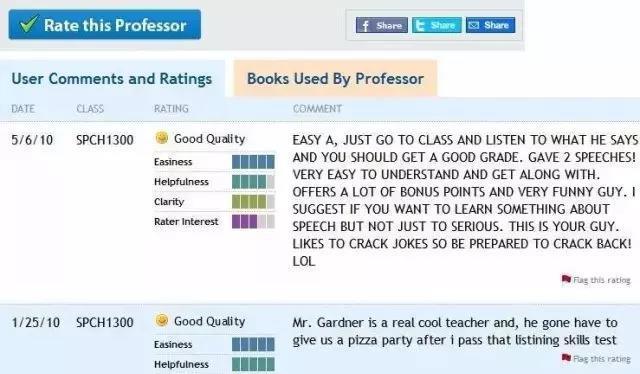 建议选课之前在 Ratemyprofessor.com 网站查阅以前选过该课程学生对教授们的评语。