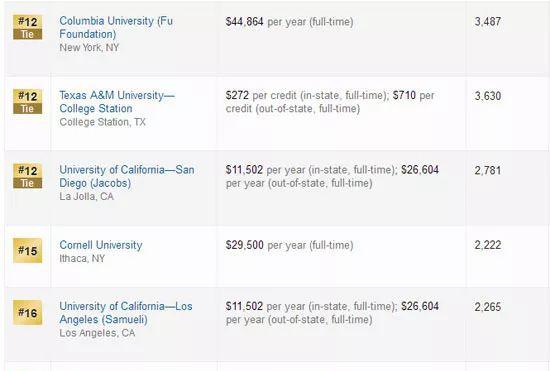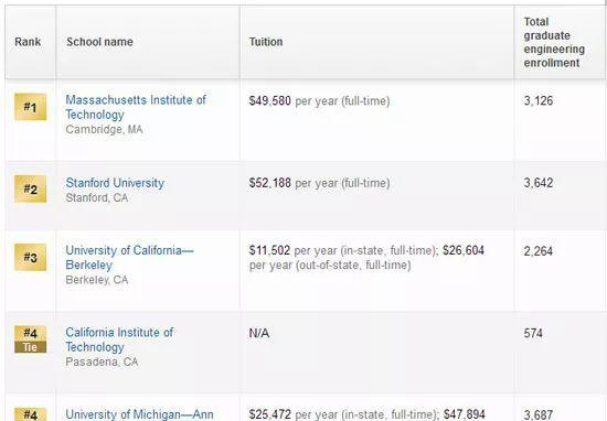 2019年USNEWS美国研究生最佳工程学院排名,整体变化不大,相较于去年工程学院排名,TOP5的美国院校位置不变:美国理工名校-麻省理工学院依旧蝉联榜首之位;斯坦福大学紧随其后,位列第二;美国著名的加州大学分校-加州大学伯克利分校名列第三;被世界公认的典型精英学府之一:加州理工学院依旧排名第四;TOP5的最后一所是位于美国宾夕法尼亚州的匹兹堡的卡耐基梅隆大学,其它美国大学工程学院排名如下: