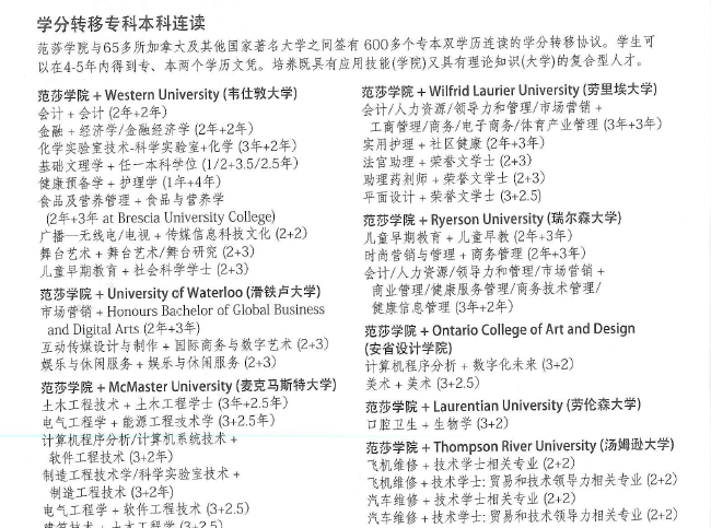 除此之外,范莎学院还与安省众多大学签订了转学分协议,例如麦克马斯特大学,圭尔夫大学,滑铁卢大学、瑞尔森大学等,学生不仅能在4-5年之内得到专、本两个学历文凭,在范莎获得宝贵的实践经验,还有机会进入大学进行深造和提升。