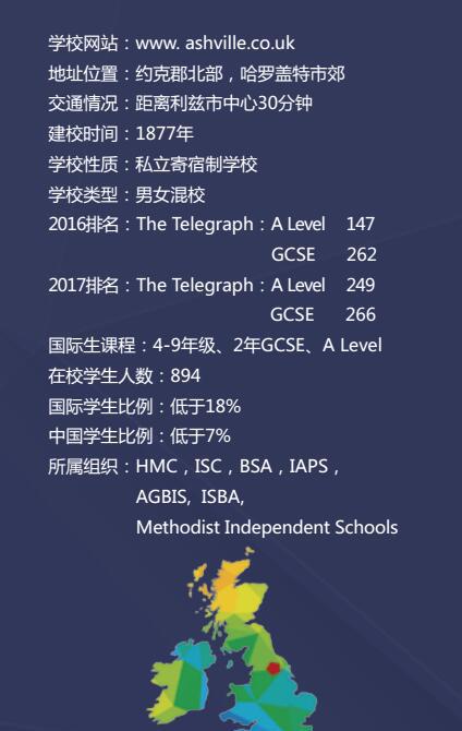 阿什维尔学院建立于1877年, 是位于英格兰北部城市Harrogate的传统寄宿学校,交通方便、享誉盛名,历史悠久,环境优美。连接市内外的铁路、道路,交通网络四通八达,十分方便。学校校规十分严谨,除了保持优良传统,亦关切学生需要,鼓励学生发展个人潜能,致力培育学生成为有智慧又友善的人。立思辰留学360介绍,学校以培养学生身心和品性共同发展为原则,注重发挥每个学生的个人潜力。学校具有强烈的责任心,鼓励学生融入集体、并教导学生慎重对待学业和他们所取得的成绩。学校不推崇枯燥、乏味的学术氛围,主张把教育融入平日的生活。学校的师资力量强大,在各个领域都有经验丰富的老师,每个老师都热爱教学,喜欢与同学交流,积极发现学生各自的长处,并鼓励学生在课堂和业余时间学会创新和自我表达的能力。